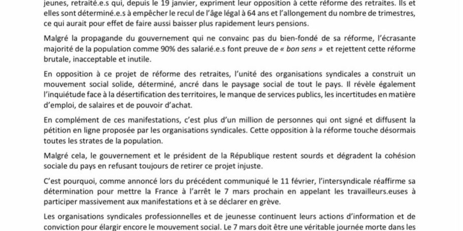 Comme annoncé lors du précédent communiqué le 11 février, l’intersyndicale réaffirme sa détermination pour mettre la France à l’arrêt le 7 mars prochain en appelant à participer massivement aux manifestations et à se déclarer en grève.