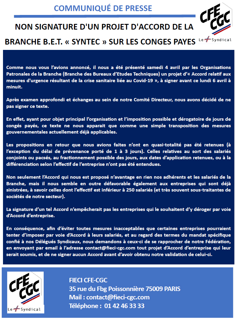 DetailsNon-Signature par la FIECI CFE CGC de l’Accord relatif à la sécurisation des parcours professionnels des acteurs du dialogue social