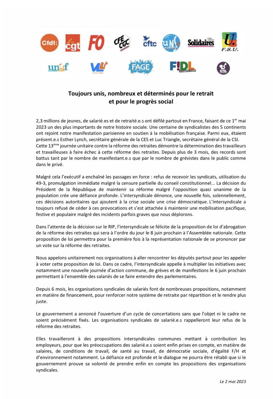 -Communiqué intersyndical- Les propos tenus par le président de la République démontrent qu’il n’a toujours pas compris la colère qui s’exprime dans le pays et s’obstine. Nous appelons à un 1er mai unitaire et populaire pour le retrait !