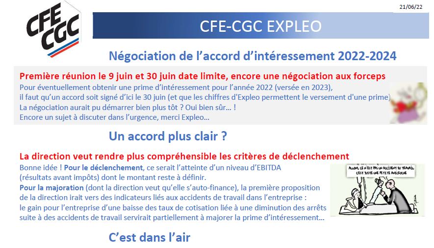 Signature de l’accord d’intéressement : pour la CFE-CGC, c’est non !! 220621-CFE-CGC_Accord-intéressement-WEB Category: Actualités21 juin 2022Post navigationPreviousPrevious post:Législatives : Emmanuel Macron poursuit ses consultations pour tenter d’éviter le blocage parlementaireNextNext post:Après les législatives, Emmanuel Macron tente le dialogue et convie les forces politiques de l’AssembléeArticles similairesBilan de la négociation sur la RCC17 mars 2025Elections CSE Expleo 2ème tour : votez pour les listes CFE-CGC !21 juin 2024Résultat jeu-concours VOUS ET VOTRE FUTUR CSE14 juin 2024Bilan 2019-2024 des actions de vos élus CFE-CGC6 juin 2024Jeu-concours VOUS ET VOTRE FUTUR CSE5 juin 2024Droits aux titres restaurant en intercontrat – Expertise handicap – Elections CSE28 mai 2024